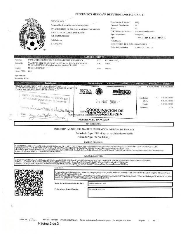 “Lo anterior busca contribuir al posicionamiento de la marca México, con impactos en una audiencia que abarca diversos sectores que representan turistas potenciales nacionales e internacionales a nuestro país, a través de la Fútbol Asociación A.C.” Contrato C28/2017