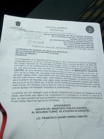 “El día 11 de Abril del 2019 nos llamó la patrona de Margarita para preguntar que no se había presentado a trabajar y la empezamos a buscar, por la tarde fuimos a presentar la denuncia de desaparición en Atizapán de Zaragoza y nos mandaron a Barrientos, pero ahí estaban de vacaciones, por la noche sus hijos que viven en Atizapán de Zaragoza vinieron a vernos y a decirnos que a su papá tampoco aparecía, por lo que tanto nosotros como ellos levantamos la denuncia por desaparición.