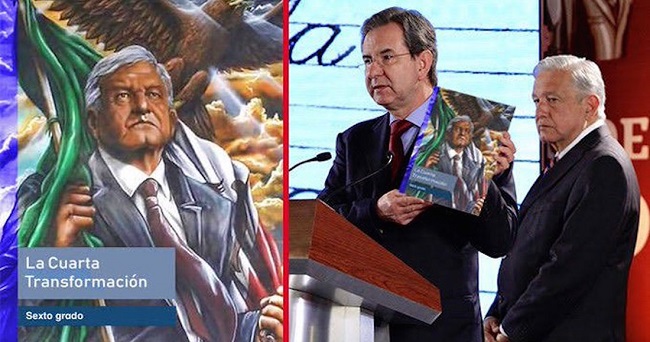 A lo largo de este fin de semana, en redes sociales ha circulado una imagen en la que se observa al Secretario de Educación Pública, Esteban Moctezuma, sosteniendo en sus manos un libro de texto gratuito en el que aparece una imagen de López Obrador en la portada.