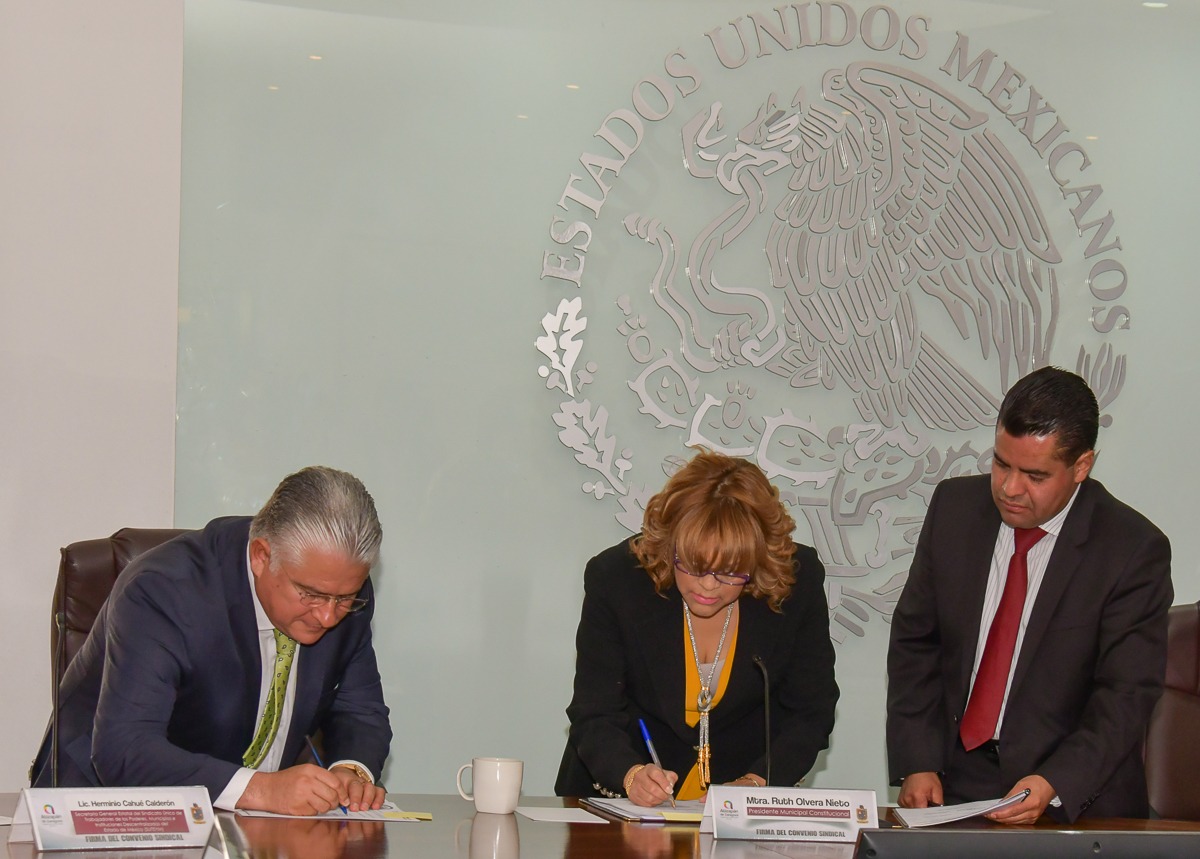 La Presidente de Atizapán de Zaragoza Ruth Olvera Nieto firmó el Convenio de Sueldos, Prestaciones, Colaterales y de Ley para 2019, con el Sindicato Único de Trabajadores de los Poderes, Municipios e Instituciones Descentralizadas del Estado de México (SUTEyM).