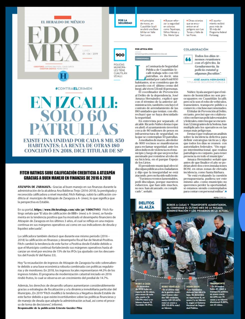 Fitch Ratings mejoró la calificación a la calidad crediticia del municipio de Atizapán de Zaragoza de de BBB+ (mex) a A- (mex), lo que fundamentó en la tendencia positiva que mostró el desempeño financiero del municipio en los últimos 3 años (2016-2018) en los que gobernó la ex alcaldesa, Ana Balderas Trejo.