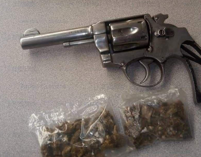 Tras una revisión, entre las pertenencias de los implicados se les localizaron un revolver calibre .38 sin cachas, además de dos envoltorios con una hierba similar a la marihuana.