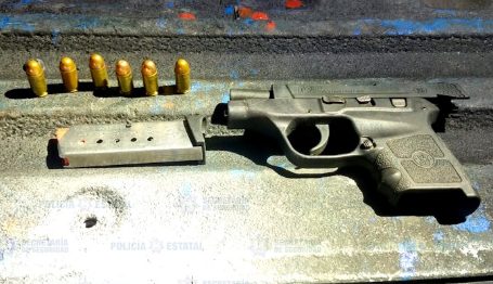 Al concluir la revisión, los uniformados localizaron al interior del vehículo un arma de fuego, tipo pistola, calibre .380 milímetros, Smith and Wesson, color negro; un cargador, seis cartuchos útiles del mismo calibre, marca Águila, y una bolsa que en su interior contenía hierba verde seca con las características propias de la marihuana.