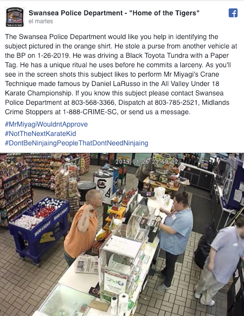 La policía de Swansea aprovechó la publicación en Facebook para “bromear” con lo sucedido, incluyendo hashtags con otras referencias de la cinta, cómo de Pat Morita, interpretando al Sr. Miyagi, maestro de LaRusso. Las citas dicen: #ElSeñorMiyagiNoApruebaEsto y #NoEsElSiguienteKarateKid.