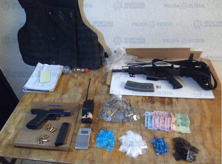 Al actuar acorde al protocolo, los policías realizaron una revisión de seguridad al interior del vehículo, donde encontraron un arma corta tipo 22, calibre .40 milímetros, con un cargador y 11 cartuchos útiles; un arma larga, modelo R15, con un cargador y 30 cartuchos útiles; una caja con hierba seca, con las características propias de la marihuana; una bolsa con polvo blanco con sustancia similar a la cocaína; un chaleco antibalas, una báscula gramera, dos pipas y dos bolsas con monedas y billetes de diferente denominación.