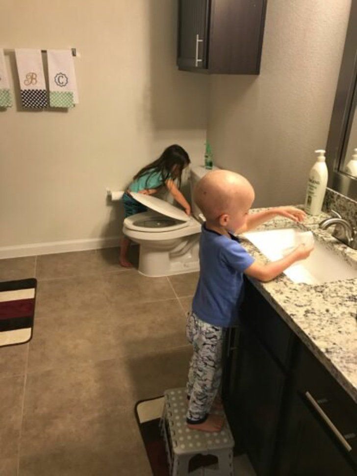 Hace unos meses, Kaitlin tomó la fotografía de Aubrey cuidando a su hermanito. Él tuvo una crisis de dolor y ella lo ayudó a sentirse mejor. Cuando pasó, la niña incluso limpió el baño para no dejar rastros de la enfermedad.