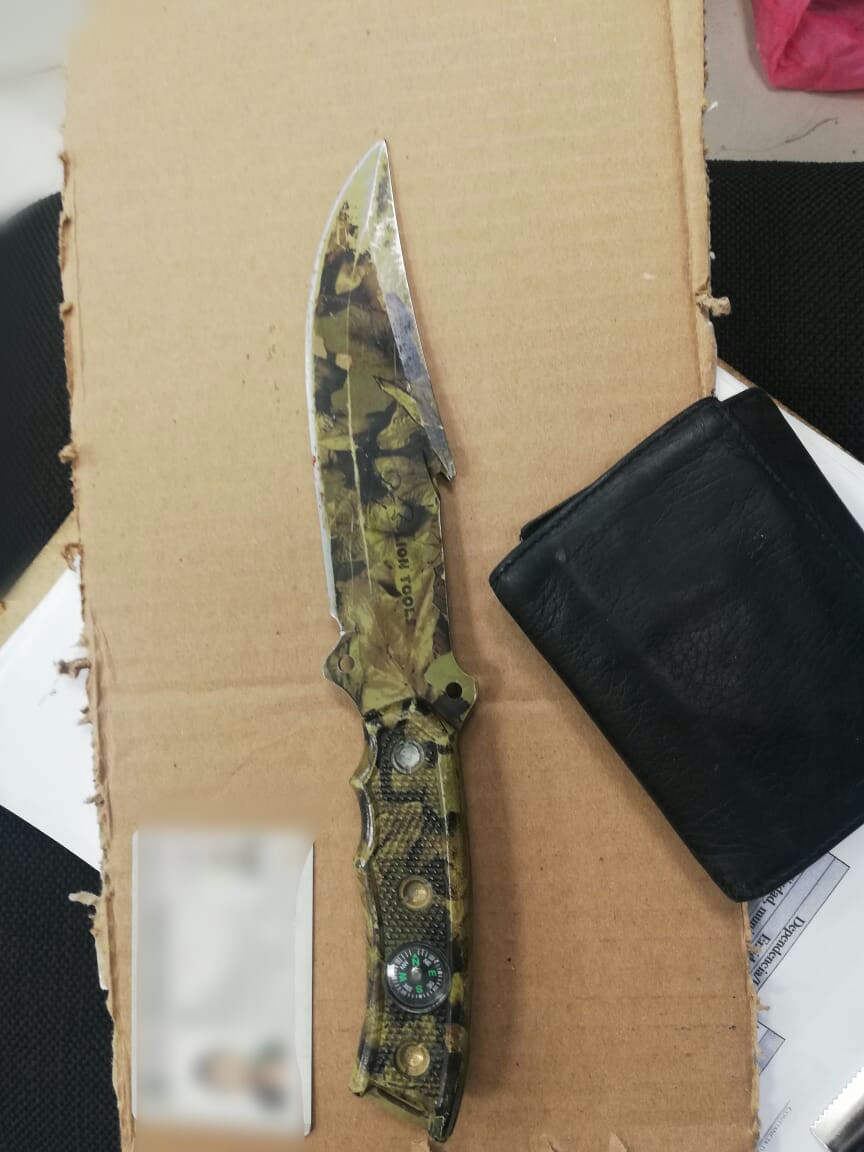 Tras hacerle de su conocimiento sus derechos y realizarle una revisión de rutina a esta persona que indico llamarse Juan Manuel “N” le fue encontrada del lado derecho de la cintura un arma punzocortante, con estampado tipo camuflaje de la marca Lion Tool de 28 centímetros de largo y terminación en punta, mismo que fue reconocido por la mujer como el objeto con el que los habría amenazado y agredido minutos antes.