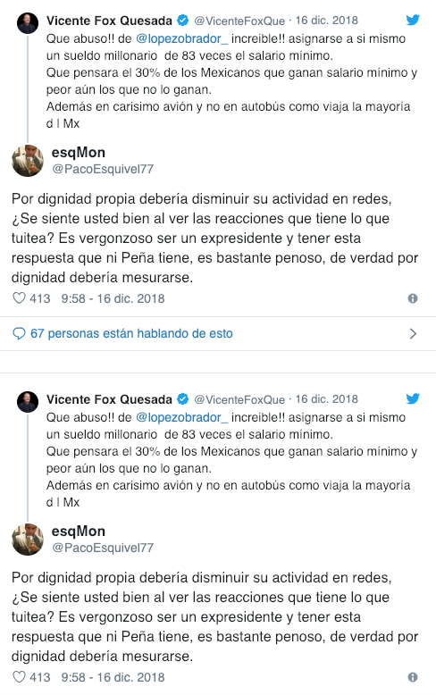 Luego de que en el Presupuesto de Egresos de la Federación (PEF) se estableció que el tabasqueño percibirá un sueldo de 108 mil 656 pesos mensuales, Fox Quesada se inconformó.