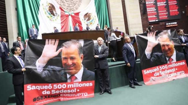 Al arranque de la sesión, panistas sacaron pancartas y dos mantas con la imagen del candidato presidencial de la coalición de los partidos Revolucionario Institucional, Verde Ecologista de México y Nueva Alianza (PRI-PVEM-NA), José Antonio Meade, para acusarlo de saqueo de 500 millones de pesos de la Secretaría de Desarrollo Social (Sedesol).