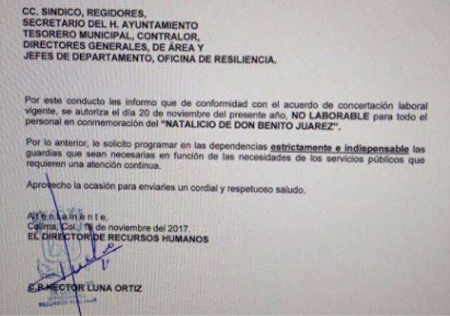 El error que cometió un funcionario del ayuntamiento de Colima se volvió viral debido a que el director de Recursos Humanos, Héctor Ortiz, autorizó el 20 de noviembre como un día no laborable porque se conmemora “el natalicio de Don Benito Juárez” y no un aniversario más del inicio de la Revolución Mexicana.