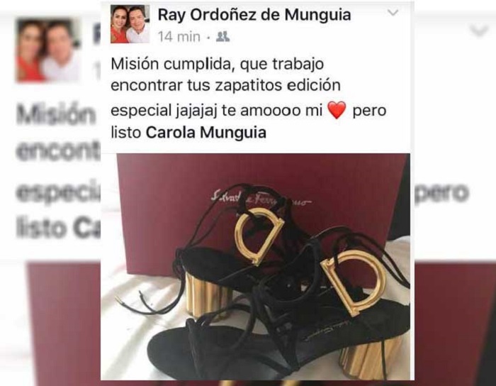 El funcionario compró sorprendió a su pareja y no dudo compartir este grato momento. “Misión cumplida, que trabajo encontrar tus zapatitos edición especial jajaja te amo mi corazón pero listo Carola Munguia”, escribió Ordoñez Meneses en su perfil de Facebook acompañando el mensaje de una fotografía de las lujosas zapatillas del diseñador italiano Salvatore Ferragamo.