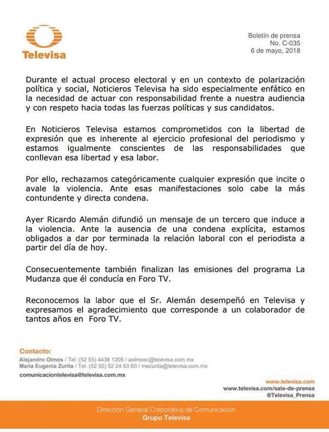 “Televisa decidió cancelar la relación laboral con Ricardo Alemán! No la comparto pero la respeto. Toda empresa tiene derecho a contratar a quién convenga a sus intereses! Ganó el linchamiento y el reclamo de censura! Los demócratas de Morena!!!”