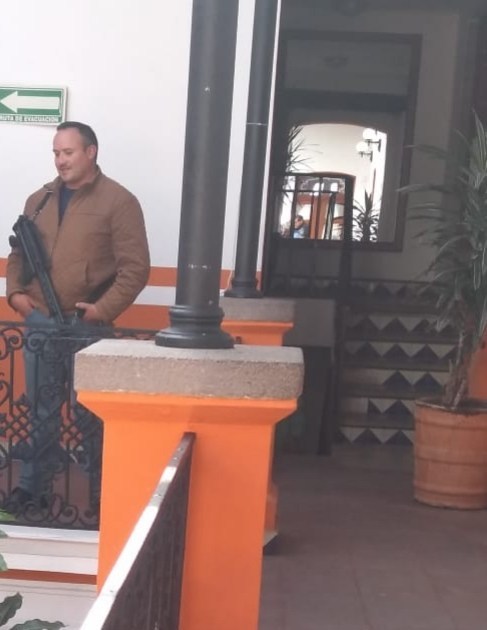 Nadie sabe hasta el momento quiénes son o qué es lo que hacen en un edificio público pero elementos de la policía municipal -de los cuales omitimos sus nombres ya que temen a las represalias- nos afirmaron que los elementos de la corporación no pueden portar armas de fuego vestidos de civiles y mucho menos de altos calibres como son 2.25 y R-15, los cuales constantemente se pueden observan en los pasillos del palacio municipal.