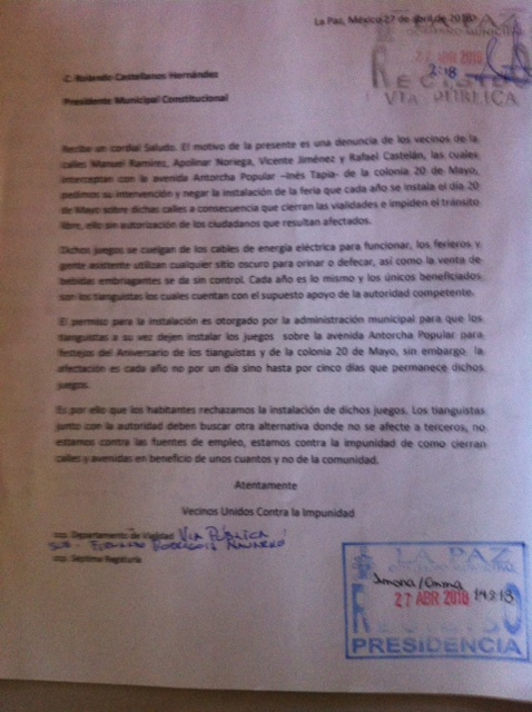 El escrito mostrado por los habitantes es del pasado 27 de abril del año en curso donde señalan que cada año es lo mismo, es decir las afectaciones en las calles, la variación del voltaje al colgarse de los cables de energía eléctrica para funcionar los juegos y la venta de alcohol se da sin restricción entre menores de edad.