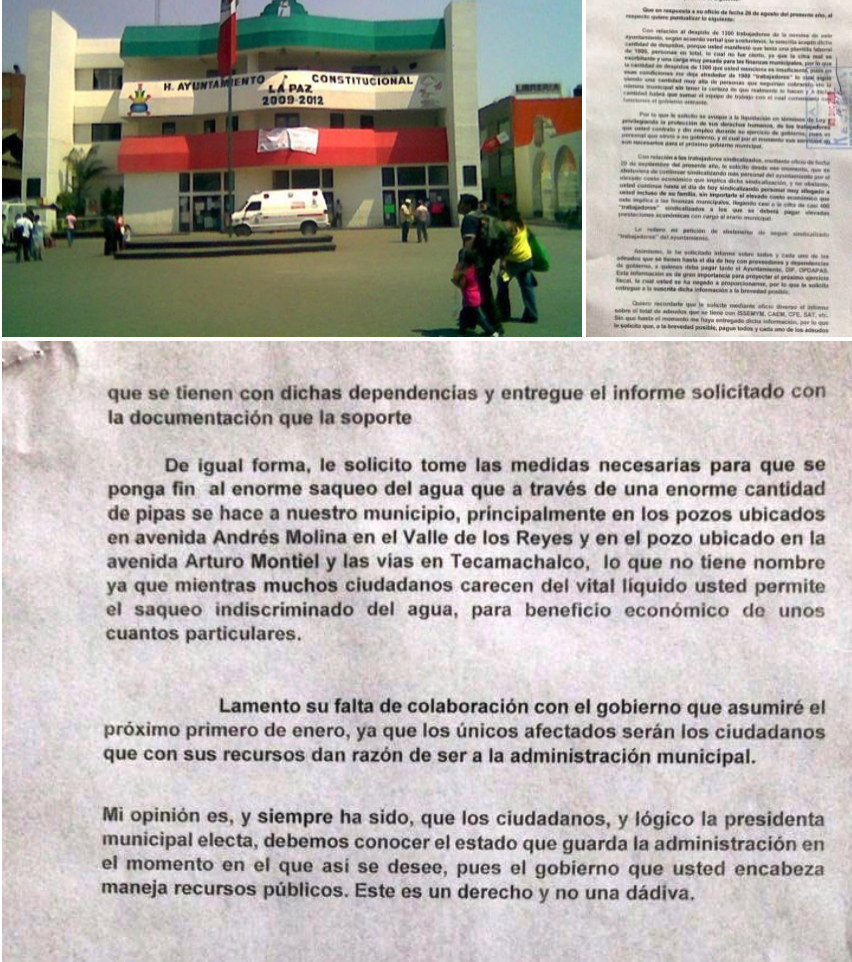 También pide que ya no siga el saqueo de los pozos de agua, ya que mientras en el municipio mucha gente carece del vital líquido el producto lo venden dejando a los habitantes sin el vital líquido; y finalmente dice el escrito que lamenta la falta de colaboración para llevar a cabo una mejor entrega de la administración.