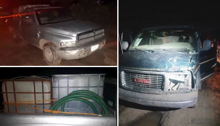 Entre éstas destacan una Chevrolet Silverado, color blanco, con dos contenedores de mil litros cada uno; el primero al 20 por ciento y el segundo al 50 por ciento de su capacidad con lo que parecía ser gasolina.