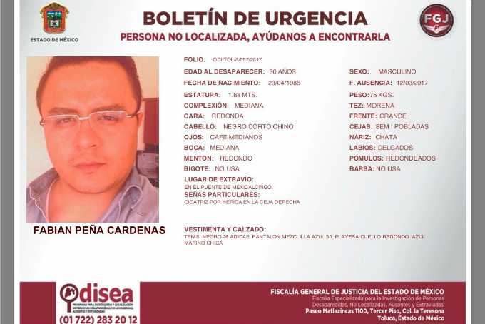 Cabe mencionar que Peña Cárdenas fue reportado como desaparecido ante la Fiscalía Mexiquense, quien activó la Alerta Odisea para su pronta localización.