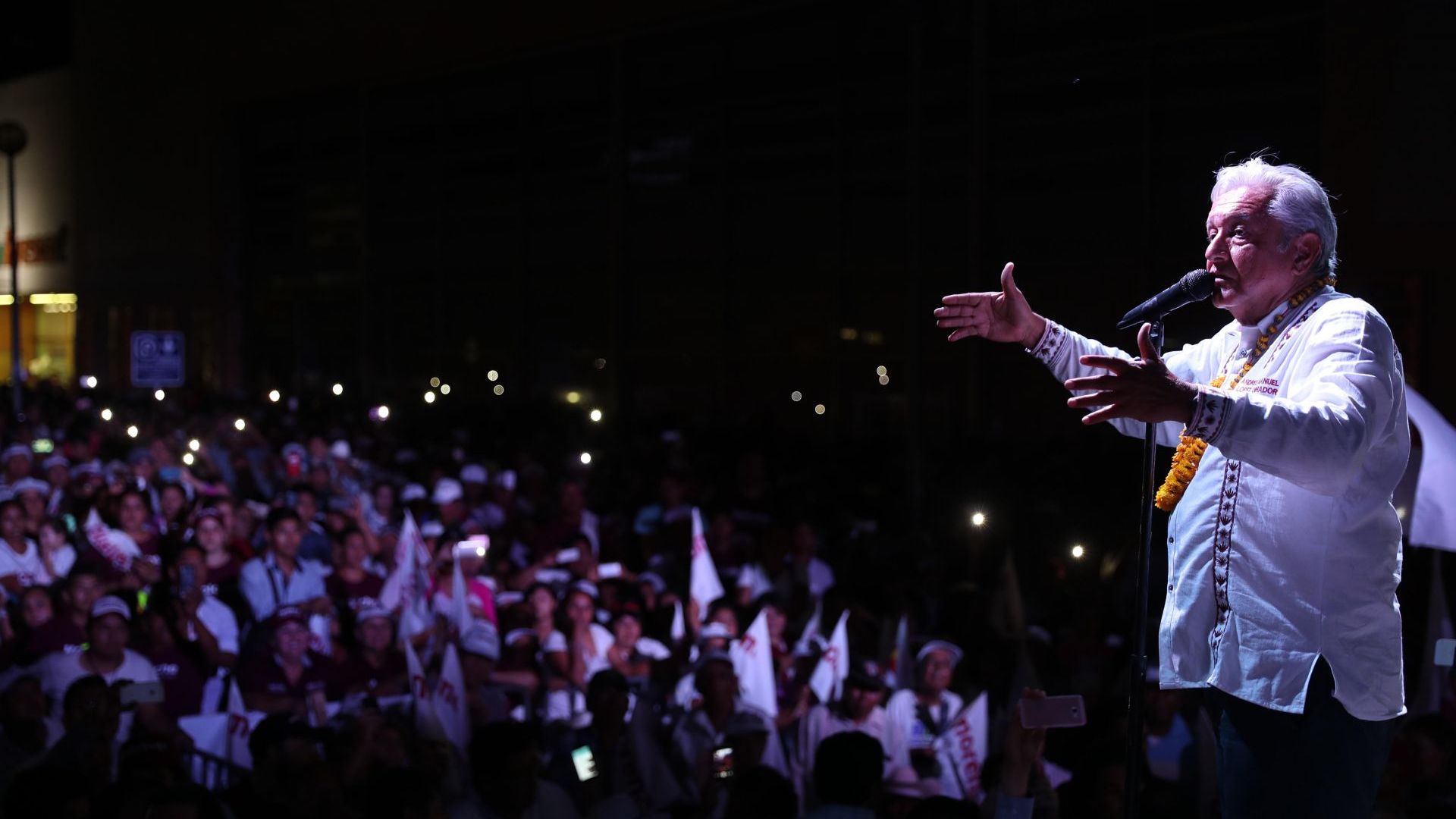 Al comenzar un mitin en esta localidad, donde se desplegó una manta de apoyo de la sección minera 222 en San Luis Potosí con la cara de Napoleón Gómez Urrutia, el tabasqueño sostuvo que es altamente probable que gane la Presidencia de la República.