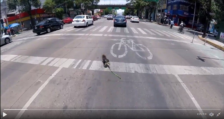 El ciclista empezó a custodiar la retaguardia del perro alertando a todos los automovilistas que bajaran su velocidad. En algunas ocasiones, el perro invadió la banqueta y pese a que la heroína gritaba que lo agarraran, las personas no escuchaban, se hacía los locos o simplemente no lo alcanzaban.