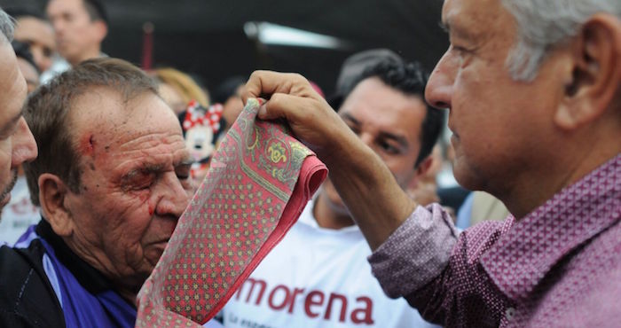 Estado de México.- El candidato del Movimiento de Regeneración Nacional (MORENA), Andrés Manuel López Obrador, sorprendió a los presentes al tener un noble gesto con un hombre que se lastimó durante unos de sus mítines: le curó la herida, lo lavó y hasta un besito le dio en la frente.
