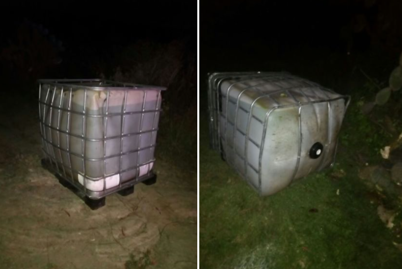 Huachicoleros dejaron abandonado dos contenedores con combustible, en una brecha en el municipio de Tepetlaoxtoc.
