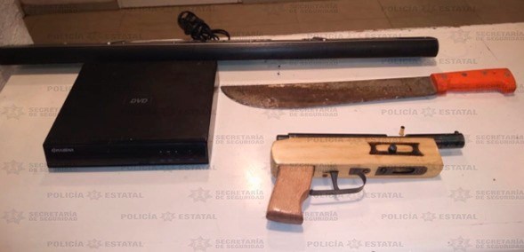 Gracias a la pronta intervención de los uniformados, lograron localizar a los probables responsables metros más adelante, para practicarles una revisión apegada al protocolo de actuación, la cual derivó en el hallazgo de un machete aproximadamente de 45 centímetros de largo, una pistola calibre 22 con la leyenda de BERETTA ITALIANA con un cartucho percutido, un reproductor DVD y una bocina, los dos últimos sustraídos del domicilio de la víctima.