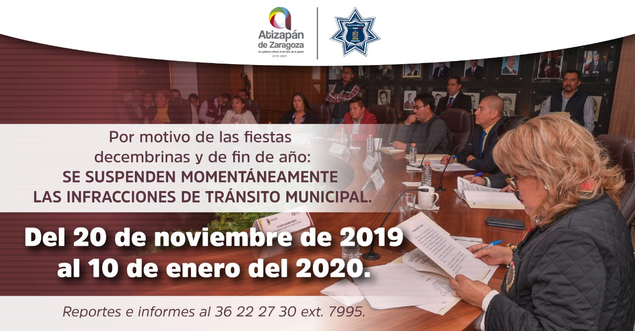 Con la intención de reforzar la seguridad en la época decembrina (según el gobierno), el Ayuntamiento de Atizapán de Zaragoza suspenderá nuevamente las infracciones de tránsito desde el 20 de noviembre de 2019 hasta el 10 de enero de 2020.