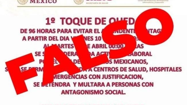 El Gobierno de México señaló que es falso un mensaje que circula por redes sociales en el cual se señala que habrá un “toque de queda” a partir del 10 de abril y que éste durará 96 horas.