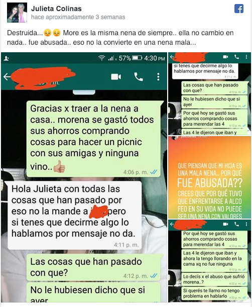 “Aprende a ser madre porque hasta el momento vienes fallando. Yo a mi hija la cuido y no voy a dejar que le pase algo”, le escribieron en una conversación de WhatsApp, aunque Colinas piensa que están discriminando a la niña por haber sido violada.