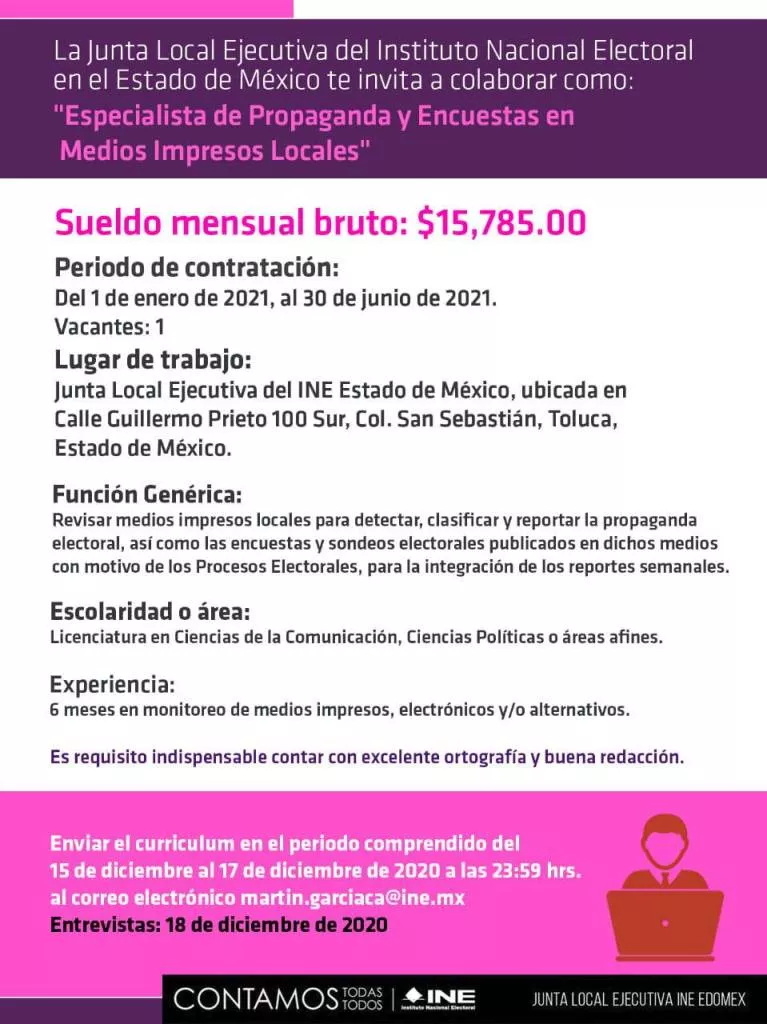 El empleo será para al cargo de Especialista de Propaganda y Encuestas en Medios Impresos Locales para el proceso electoral del siguiente año.