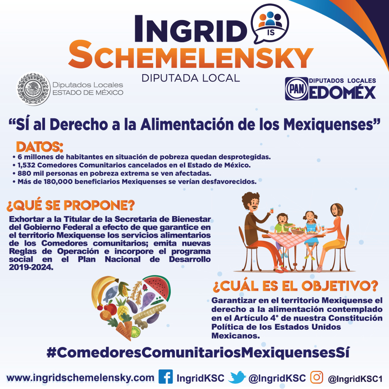 El día de hoy durante la sesión Plenaria del Poder Legislativo Mexiquense, la Diputada Ingrid Schemelensky, así como los Diputados, Edgar Olvera y José Antonio García, presentaron la proposición con Punto de Acuerdo de urgente y obvia resolución, por el que se exhorta a la Titular de la Secretaria de Bienestar del Gobierno de México; a efecto de que garantice en el territorio del Estado de México la operatividad, el adecuado funcionamiento, supervisión y prestación de servicios alimentarios de los Comedores Comunitarios; así como emitir nuevas Reglas de Operación; e incorporar el programa social en el Plan Nacional de Desarrollo 2019-2024.