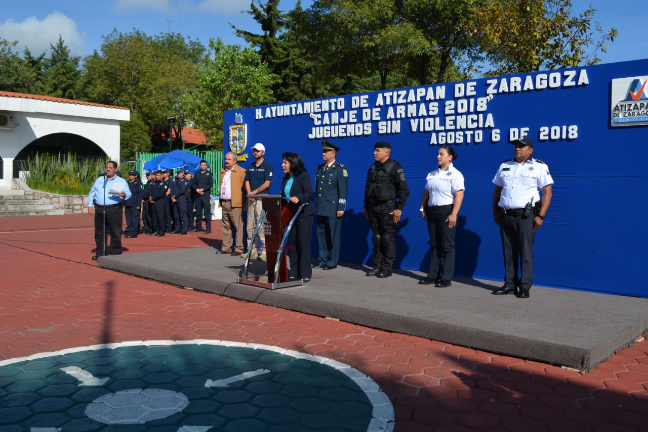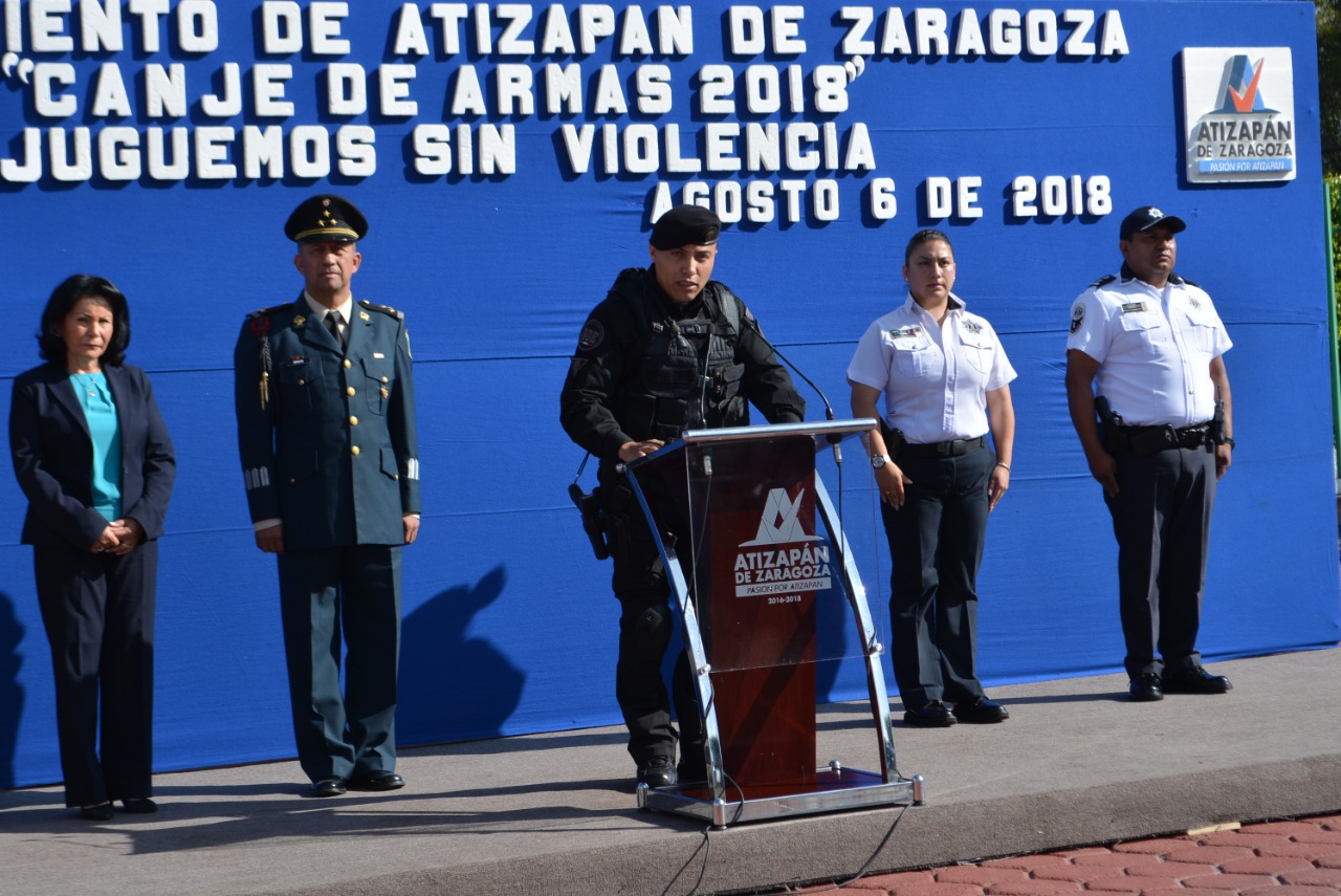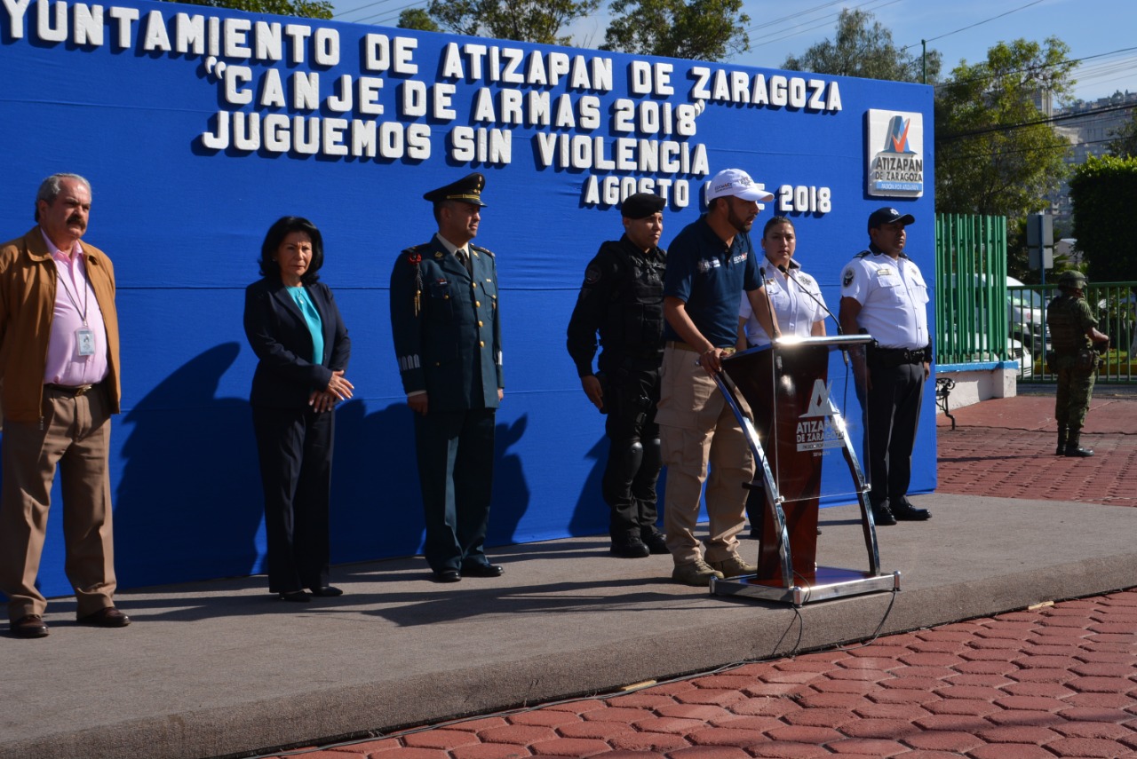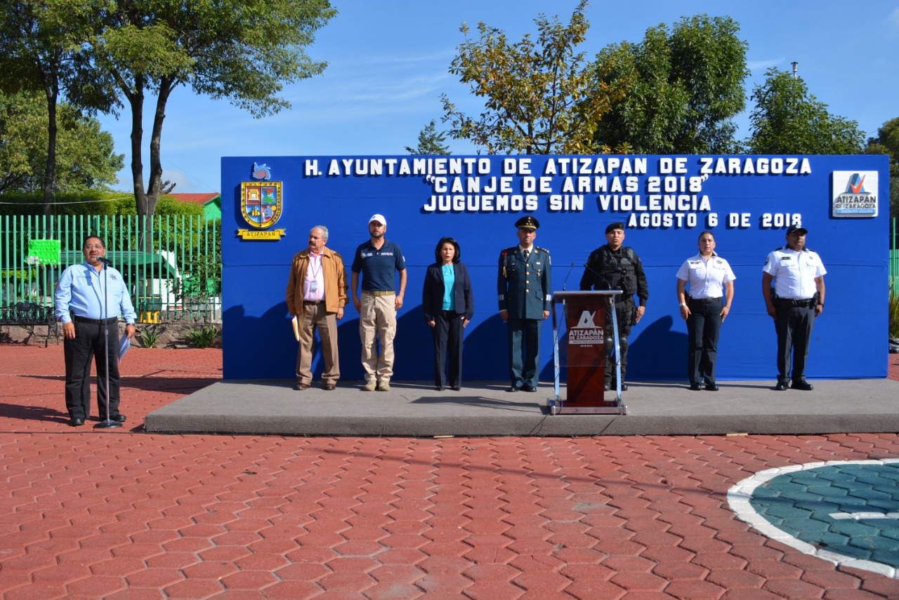 Como parte de las acciones implementadas para garantizar la seguridad de la población en Atizapán la Dirección de Seguridad Pública y Tránsito Municipal en conjunto con Autoridades del Gobierno del Estado de México y Personal de la Secretaría de la Defensa Nacional llevan a cabo el Programa Canje de Armas 2018 “Juntos Contra la Violencia” en la Explanada de este Ayuntamiento.