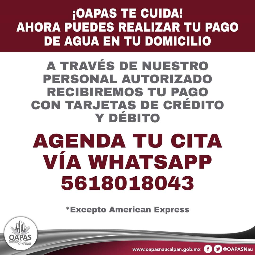 A partir de hoy, el Organismo de Agua Potable, Alcantarillado y Saneamiento (OAPAS) de Naucalpan ofrecerá la modalidad de cobro a domicilio, en apoyo a los usuarios que no han podido realizar su pago de derechos de agua debido a las restricciones de movilidad por la emergencia sanitaria por COVID-19.