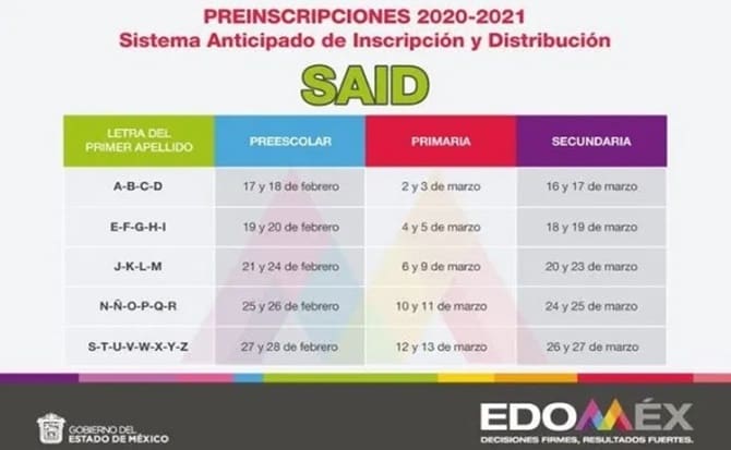 Las fechas de preinscripción serán de acuerdo con la letra inicial del primer apellido del menor, siendo que los días 2 y 3 de marzo, están destinados para las letras A, B, C, D; 4 y 5, para los de la letra E a la I; 6 y 9 para las letras de la J a M; 10 y 11, de la N a R; mientras que el 12 y 13 de marzo será para los apellidos que inicien con la letra S hasta la Z.