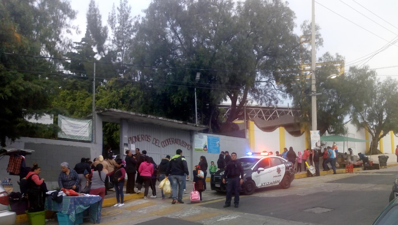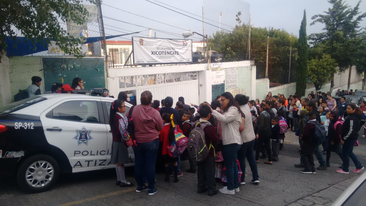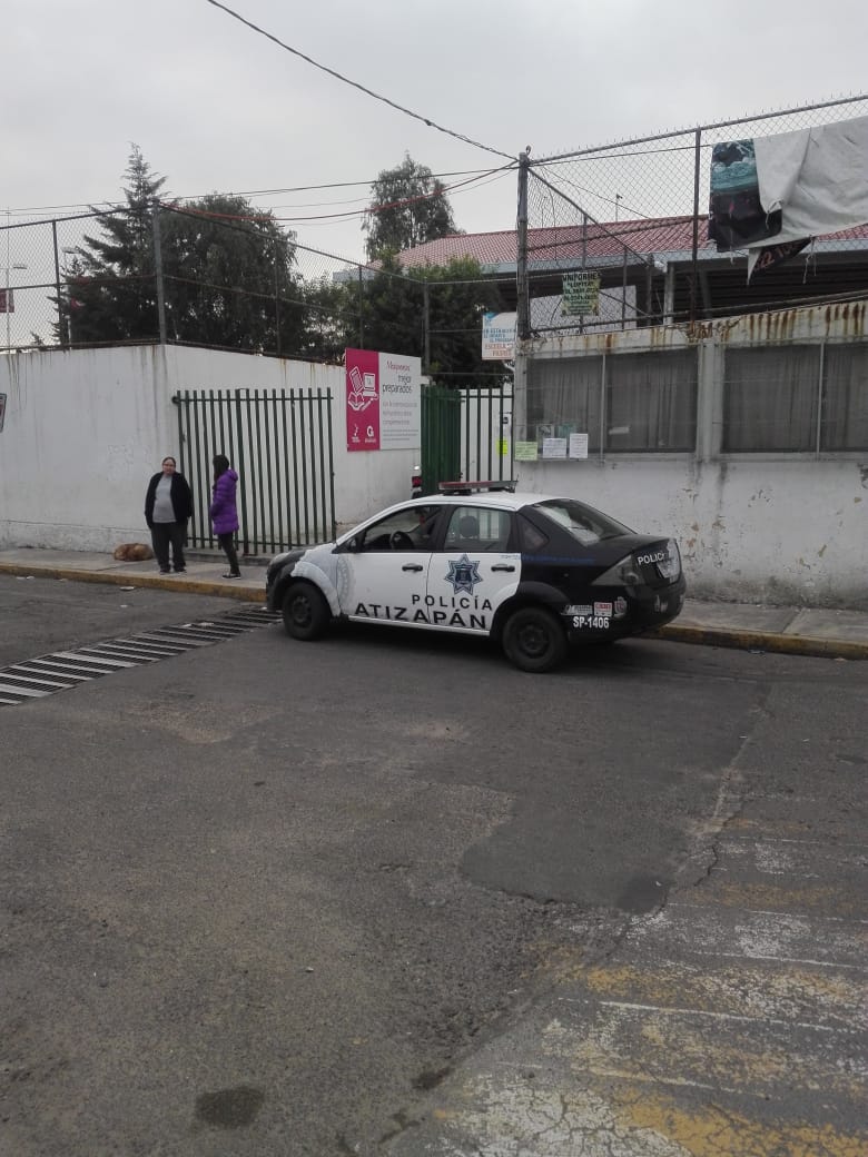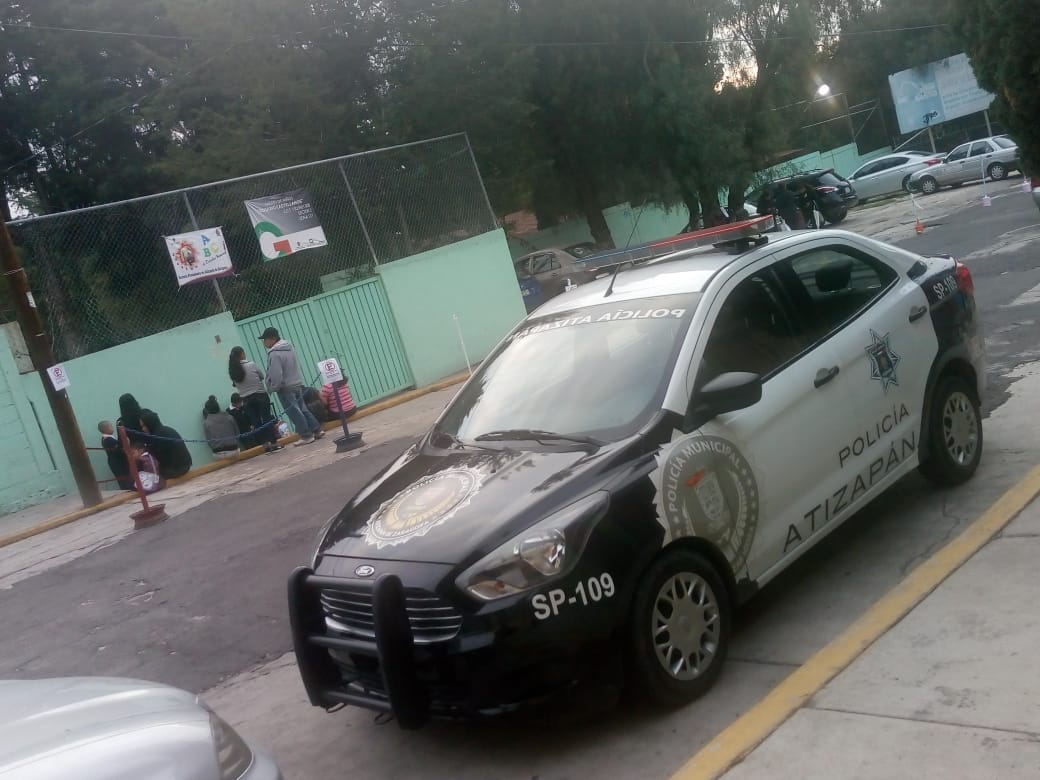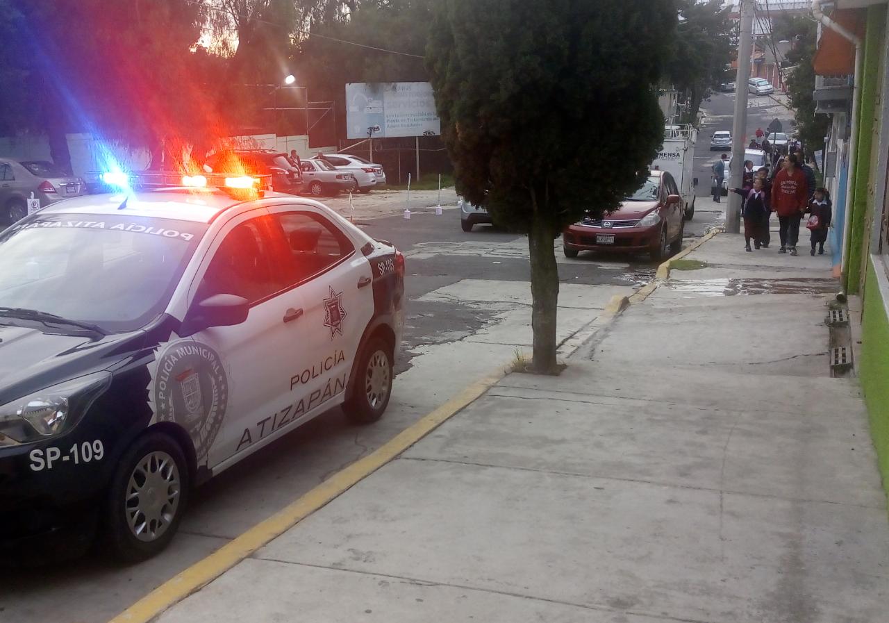 Elementos de la Policía Municipal de Atizapán vigilan la entrada y salida de alumnos en las escuelas para prevenir ilicitos y evitar conflictos vehiculares.