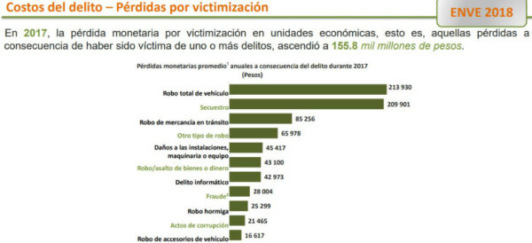 De acuerdo con la Encuesta Nacional de Victimización de Empresas 2018, se estima que para 2017, el costo total a consecuencia de la inseguridad y el delito en unidades económicas representa un monto de 155.8 mil millones de pesos, es decir, 0.86% del PIB.