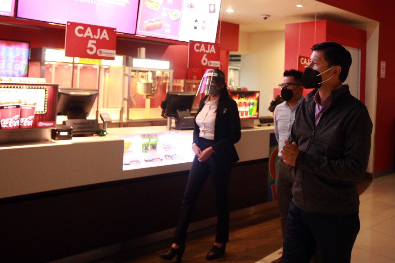 El Secretario de Desarrollo Económico, Alfredo Vinalay Mora, acudió al Cinemex Gran Terraza Lomas Verdes y al Cinemex Cuatro Caminos para constatar que se respetan la sana distancia, el aforo máximo del 30 por ciento y medidas de higiene personal, como la toma de temperatura y la aplicación de gel alcoholado.