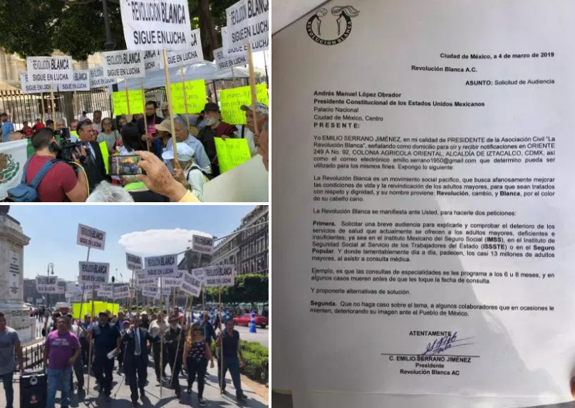 Integrantes de la Revolución Blanca, conformada principalmente por adultos mayores, se manifestaron este lunes frente a las puertas de Palacio Nacional, para demandar al gobierno federal que se incremente el presupuesto para el Sector Salud.