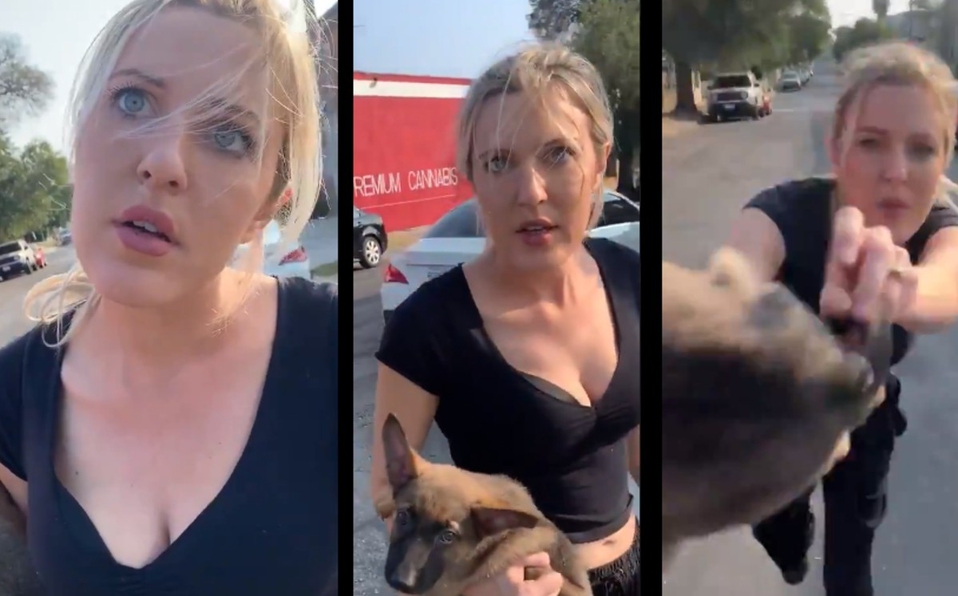 En el video se ve cómo la mujer –apodada como Karen, etiqueta utilizada para representar a las personas racistas– asecha al hombre con la mirada mientras carga a un perrito.