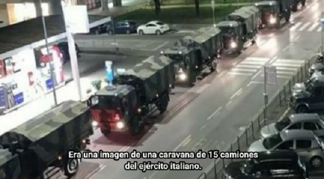 Camiones del ejercito llevan ataudes con muertos por COVID-19 para incinerarlos.
