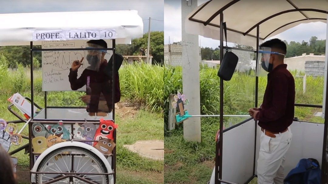 De acuerdo a Publimetro, Gerardo Ixcoy es un maestro de Santa Cruz del Quiché en Guatemala que recorre varios kilómetros diarios con su aula móvil en una bicicleta para enseñar a los alumnos que no han tenido la oportunidad de tomar sus clases virtuales por falta de internet o computadora, el maestro respeta siempre la sana distancia, además lleva un pizarrón blanco y una mano de cartón en un palo que le ayuda a calcular el distanciamiento social.
