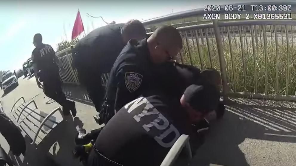 Un agente de la Policía de Nueva York ha sido suspendido tras usar una llave de estrangulamiento prohibida por el Cuerpo para inmovilizar a un ciudadano negro cuando era arrestado.