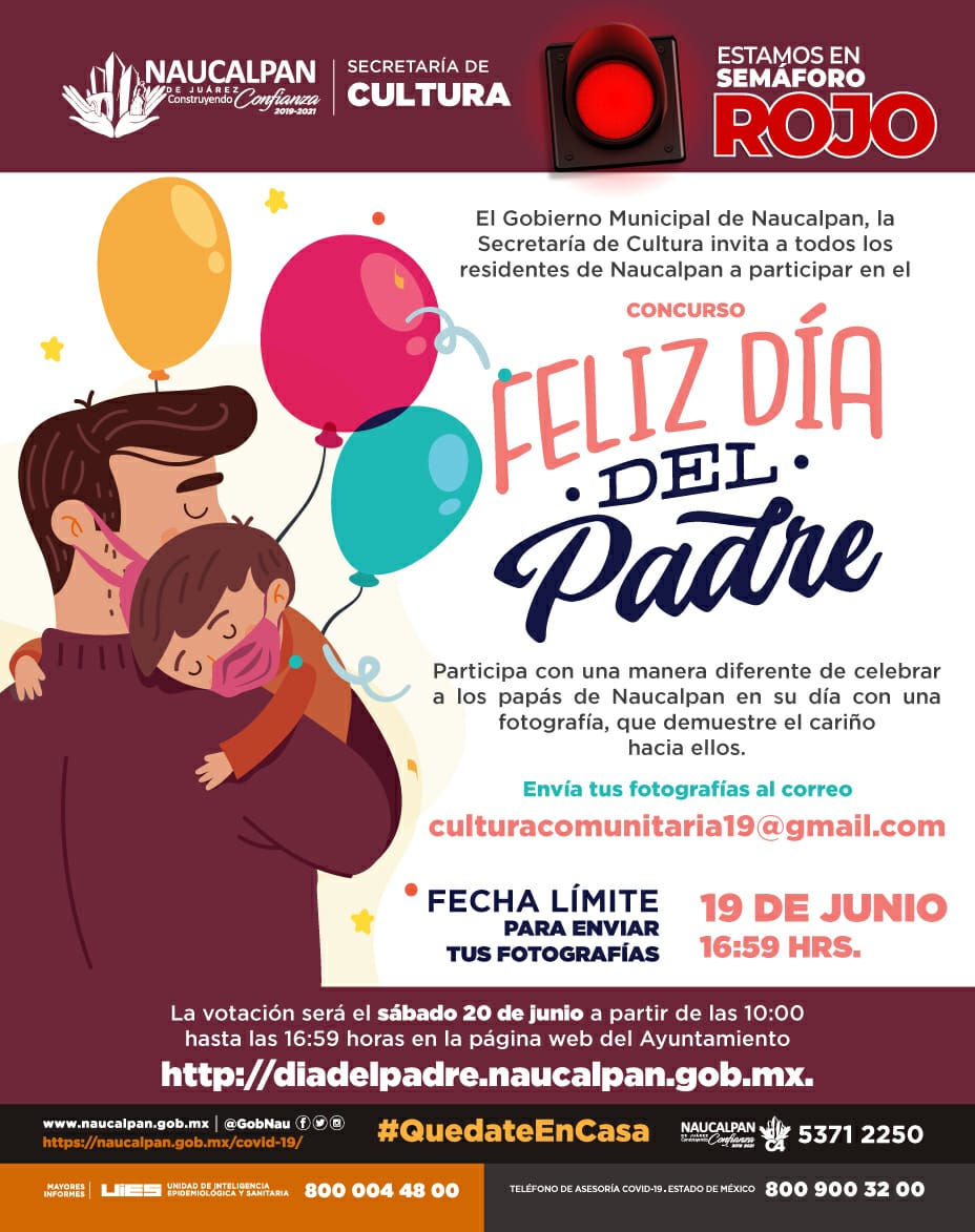 La Secretaría de Cultura municipal invitó a los naucalpenses a participar en el concurso “Feliz Día del Padre”, con el que se busca incentivar la creatividad para festejar esta fecha sin desatender las medidas preventivas por la emergencia sanitaria por COVID-19.