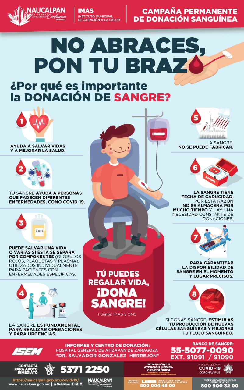 El Gobierno de Naucalpan, a través del Instituto Municipal de Atención a la Salud (IMAS), invita a la ciudadanía a sumarse a la campaña de donación de sangre “No abraces, pon tu brazo”, en el marco del Día Mundial del Donante de Sangre, que se celebra hoy.