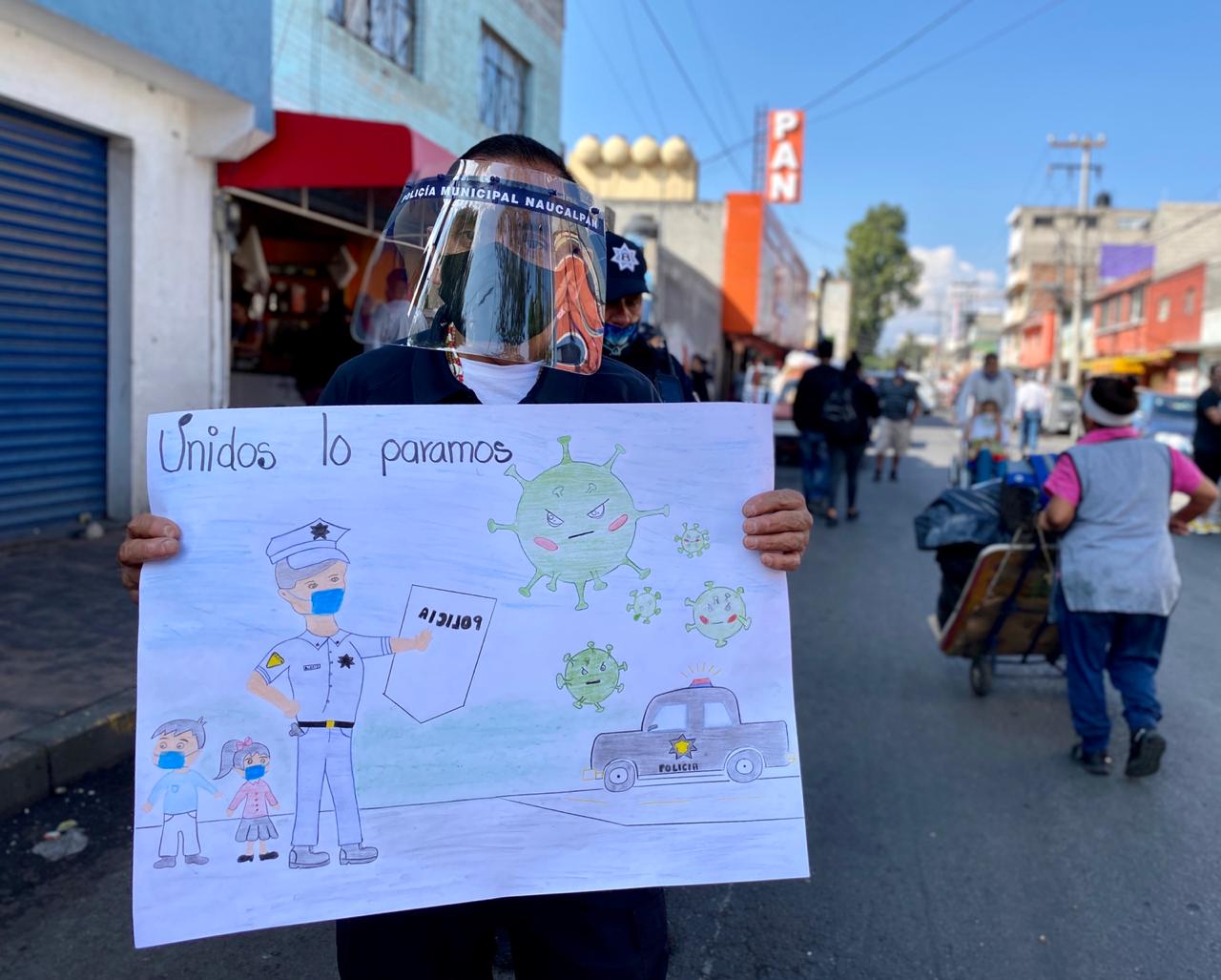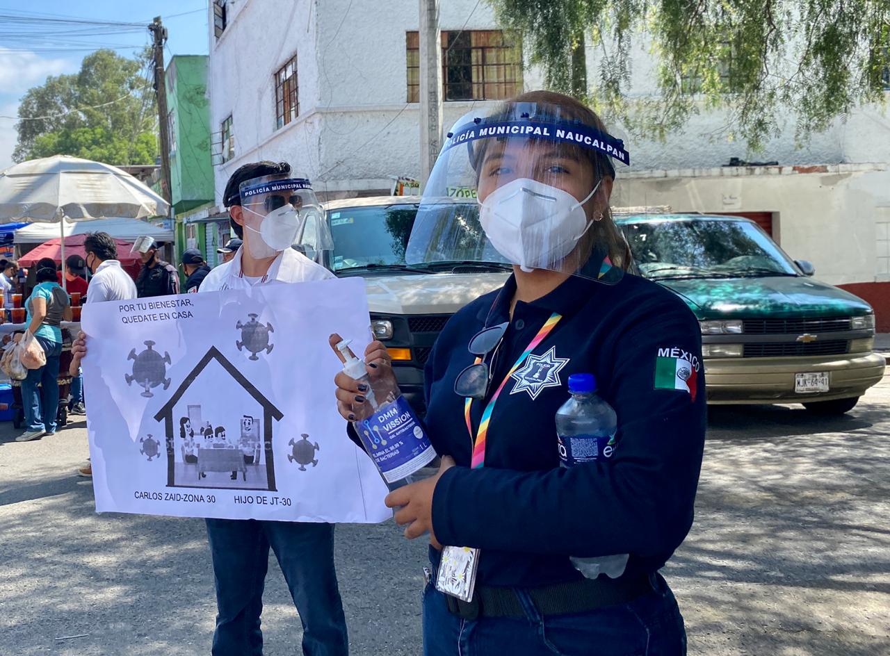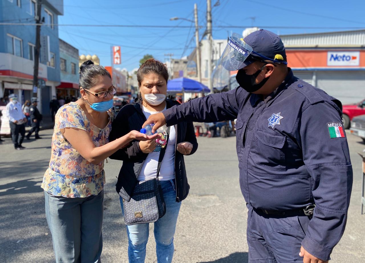 Cerca de 40 elementos de la Dirección General de Seguridad Ciudadana y Tránsito Municipal recorrieron la calle Ferrocarriles Nacionales y la avenida Ahuizotla, a fin de exhortar a quienes realizan sus compras de víveres y artículos de limpieza en el tianguis a que tomen las medidas sanitarias adecuadas.