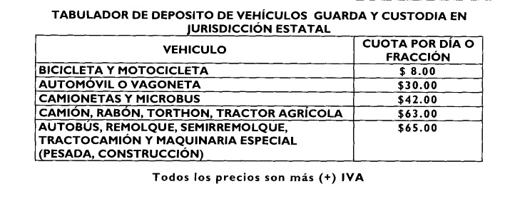 Asimismo, el tabulador de depósito de vehículos guarda y custodia se clasifica de acuerdo a los vehículos, cabe destacar que el precio más bajo por día es de ocho pesos para bicicletas y motocicletas, y para autobuses, remolques, tracto- camión y maquinaria pesada es de hasta 65 pesos.