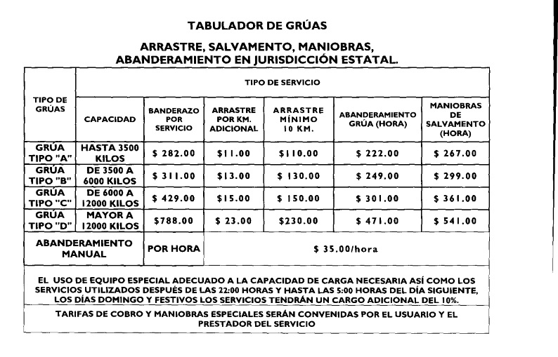 Especifica el tipo de grúa según la magnitud del vehículo, los costos del banderazo por servicio, el arrastre y maniobras de salvamento por hora. Es importante señalar que los servicios utilizados después de las 10:00 pm y hasta las 5:00 am del día siguiente, domingos y fechas festivas, tendrán un cargo adicional del 10 por ciento.
