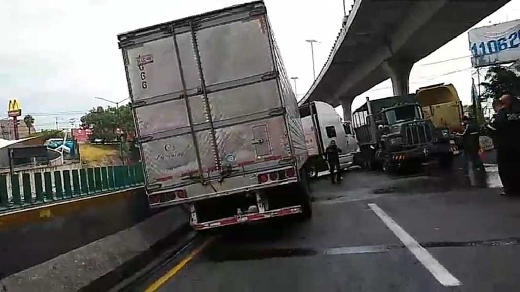 Y de pronto un trailer colapsó, aparentemente por el piso mojado, debido a las lluvias de las últimas horas, y perdió el equilibrio, para luego chocar contra estos tres vehículos militares.
