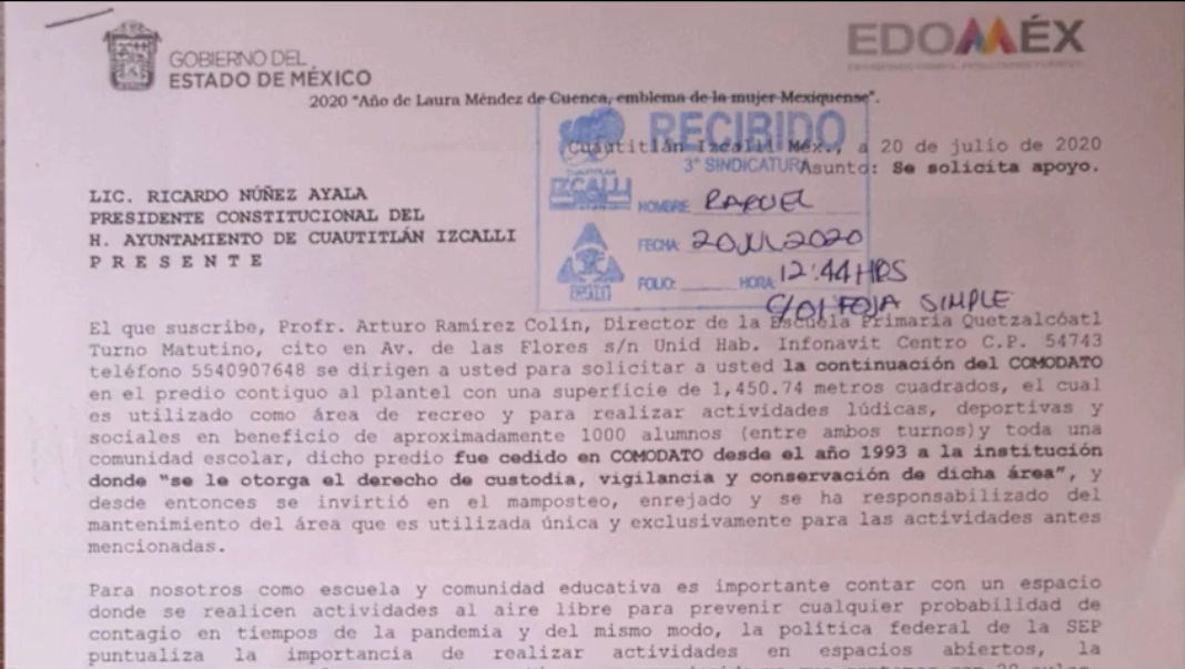 Ya que tenían en comodato un terreno contiguo a su escuela, pero este ya venció y actualmente el presidente municipal tiene otros interese$ sobre el uso y explotación de este predio; al grado de que ya hubo un altercado entre padres de familia y funcionarios que se presentaron en el terreno, para tomarle medidas, mismos que supuestamente amenazaron de remitir a la fiscalía, a aquellas personas que se opongan a su trabajo.
