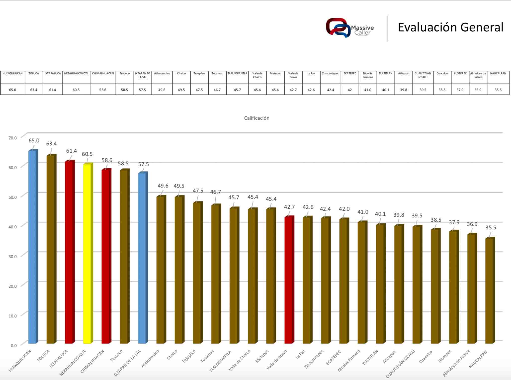 De acuerdo con una evaluación de gobierno, de la empresa Massive Caller, realizada a 26 municipios, Huixquilucan (Enrique Vargas del Villar) se coloca en el primer lugar de aceptación, mientras Naucalpan (Patricia Durán Reveles) ocupa el último. Toluca (Juan Rodolfo Sánchez Gómez) en segundo; Ixtapaluca, tercero; Nezahualcóyotl, cuarto; Chimalhuacán, quinto.